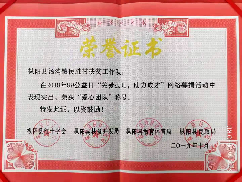 10月17日枞阳县举行2019年99公益日“关爱孤儿、助力成才”项目资金发放仪式,民胜村扶贫工作队荣获了“爱心团队”称号,812队驻村工作队队长丁晖作了交流发言,
